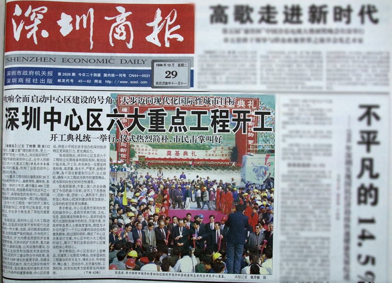 1998年12月29日,深圳商報頭版報道深圳中心區(qū)六大重點(diǎn)工程開工