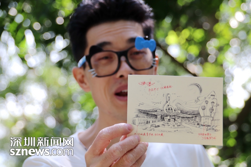 青松告訴記者,2008年剛到深圳時,他就被市民中心的造型所吸引,畫下了上面這幅畫