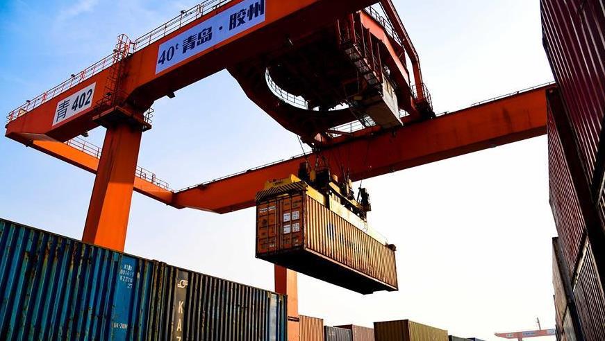 2018年5月7日,在青島膠州灣國際物流園,龍門塔吊在往中亞班列上裝載貨物。來源:新華網(wǎng)