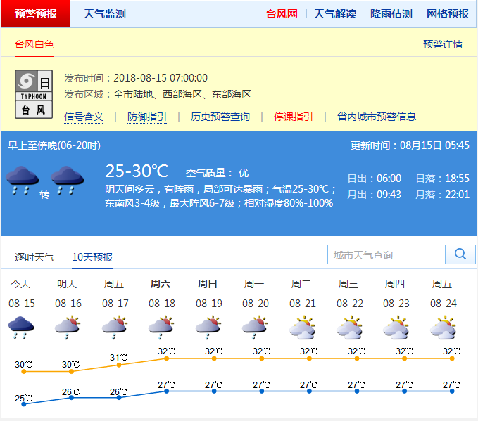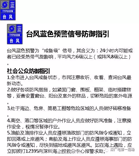 深圳市氣象臺于2018年08月14日07時30分將全市臺風(fēng)白色預(yù)警升級為藍(lán)色,預(yù)計受“貝碧嘉”影響,我市陣風(fēng)將增至8級以上,全市進入臺風(fēng)戒備狀態(tài),落實各項防風(fēng)措施,及時組織戶外、高空、港口及海上作業(yè)人員做好防御工作。