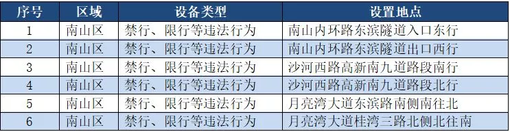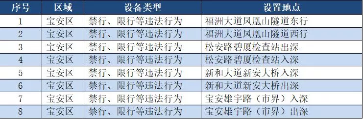 另外,重點整治機動車禁行、限行等多種違法行為的交通技術(shù)監(jiān)控設(shè)備,深圳交警公布啟用87套。涉及福田區(qū)、羅湖區(qū)、南山區(qū)、寶安區(qū)、龍崗區(qū)、龍華區(qū)、光明新區(qū)、坪山區(qū)、大鵬新區(qū)等9個區(qū)域。