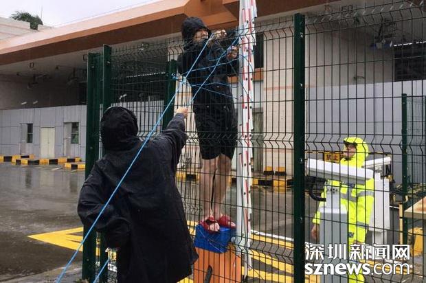 邊檢技術(shù)民警冒雨在搶修被強(qiáng)臺(tái)風(fēng)損毀的車(chē)道閘桿