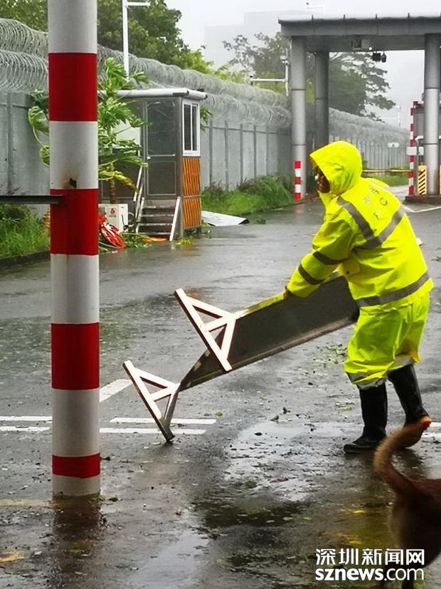 邊檢民警冒雨在拾取被強(qiáng)臺(tái)風(fēng)掀倒現(xiàn)場(chǎng)通關(guān)標(biāo)識(shí)牌