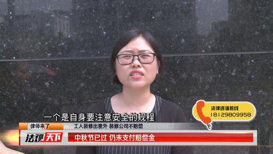 中秋節(jié)已經過去3天了,截至記者發(fā)稿,蜂巢裝飾有限公司仍未支付給受傷工人朱先生第一筆賠償金。工友朱先生已經很寒心,他說自己怎么都想不到蜂巢裝飾公司會這樣沒有誠信,《法觀天下》嘉賓律師趙乙橋表示,根據《深圳市建筑施工行業(yè)參加工傷保險的管理辦法》,她建議施工方能夠及時的給工人購買意外保險,如遇類似的意外可以有效地分擔賠償。(記者鄭興)
