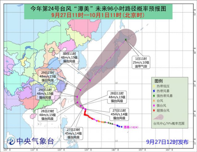 另據(jù) @廣州天氣,"潭美"28-29日最接近臺(tái)灣,隨后掉頭往東北方向移動(dòng),國慶期間前往臺(tái)灣的朋友不用擔(dān)心。
