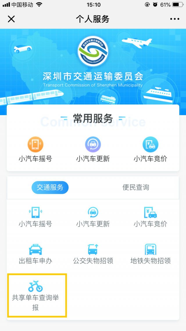 關注并進入「深圳交委」微信公眾號;點擊「便民服務」菜單欄 &;在「交通服務」分類下就可以找到「共享單車查詢舉報」功能了!