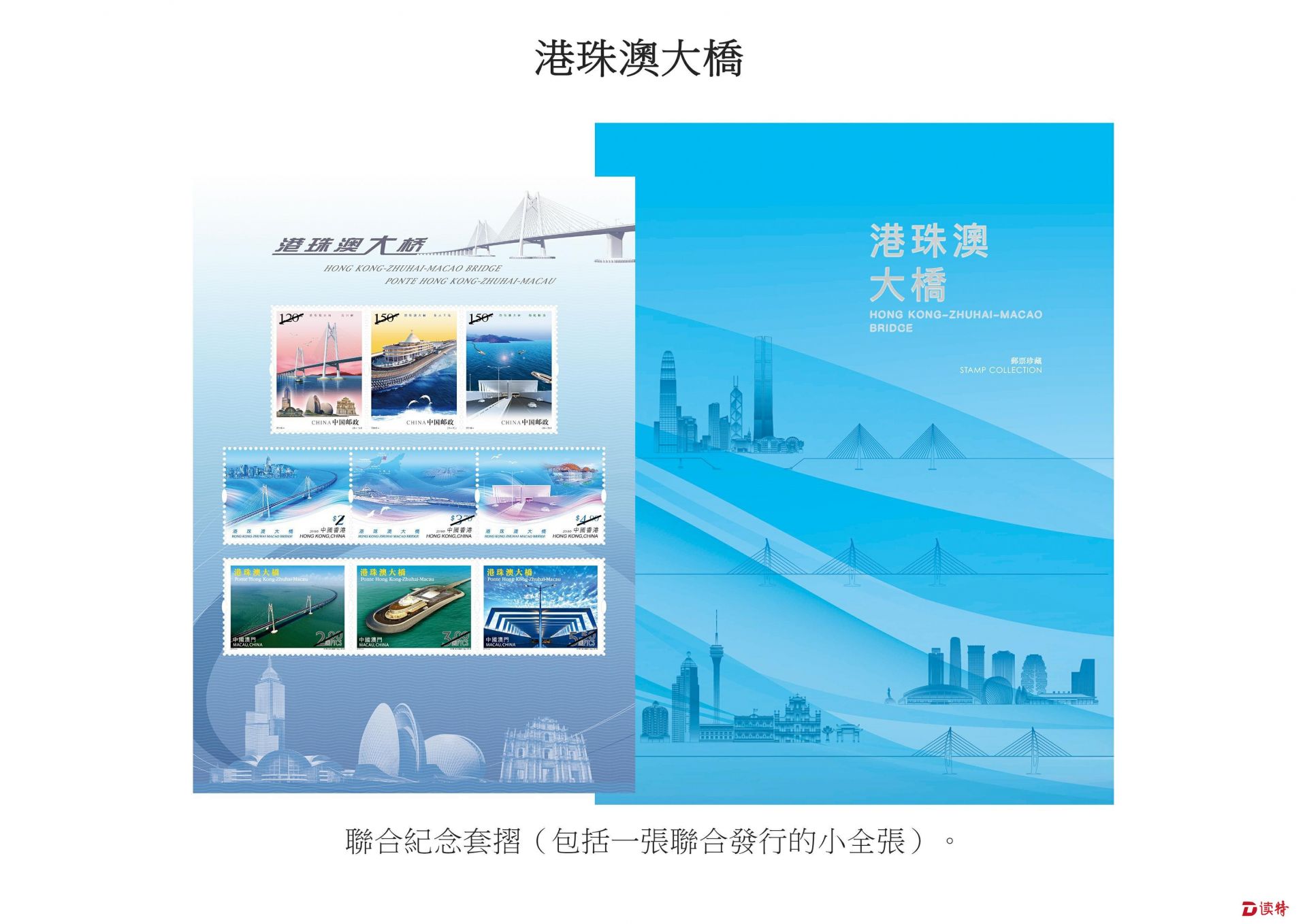 為紀(jì)念大橋啟用,中國郵政、香港郵政和澳門郵電于同日共同發(fā)行一款聯(lián)合紀(jì)念套折,內(nèi)附一張小全張,嵌有由三地郵政發(fā)行的特別郵票各一套。