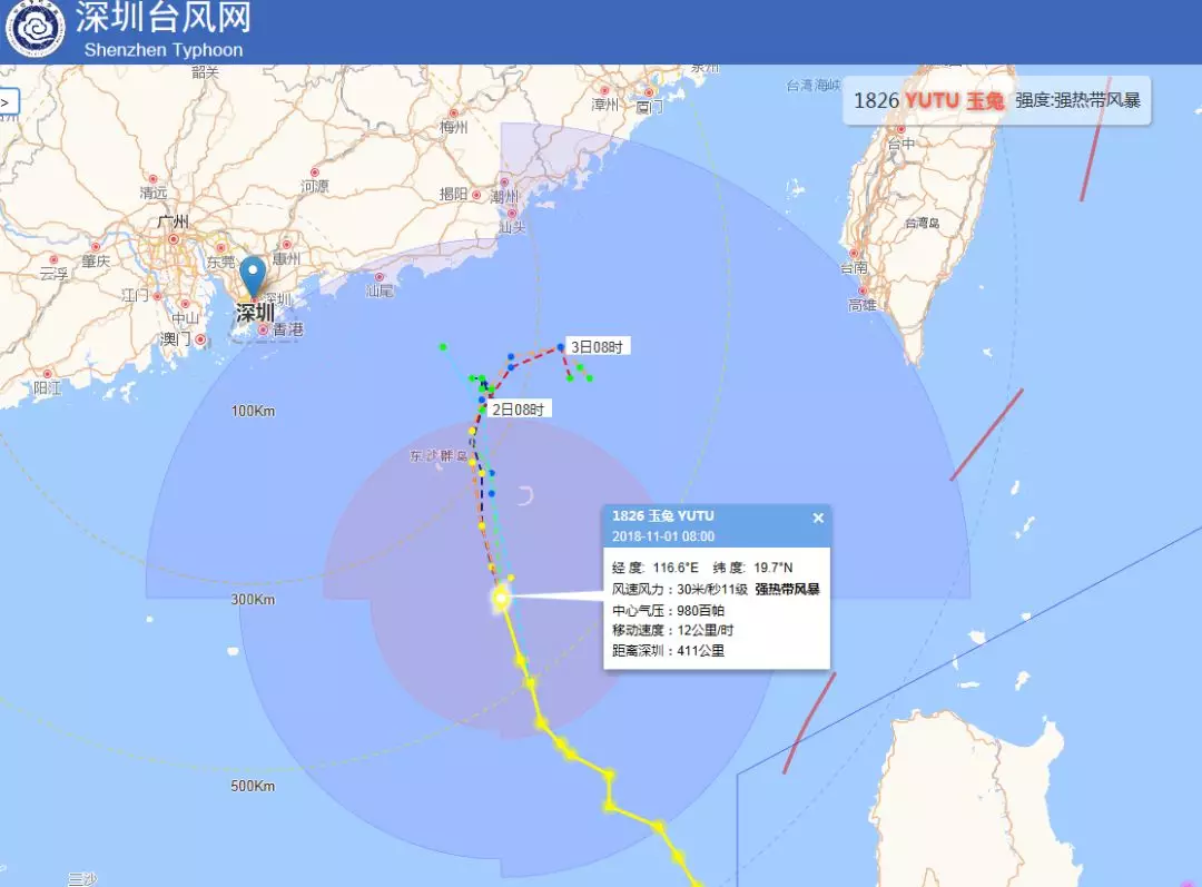 11月1日上午08時(shí)臺(tái)風(fēng)“玉兔”位于距離深圳411公里的南海海面上,其中心附近最大風(fēng)力11級(30米/秒),預(yù)計(jì)臺(tái)風(fēng)“玉兔”將以12km/h的速度緩慢北行,2日強(qiáng)度明顯減弱。