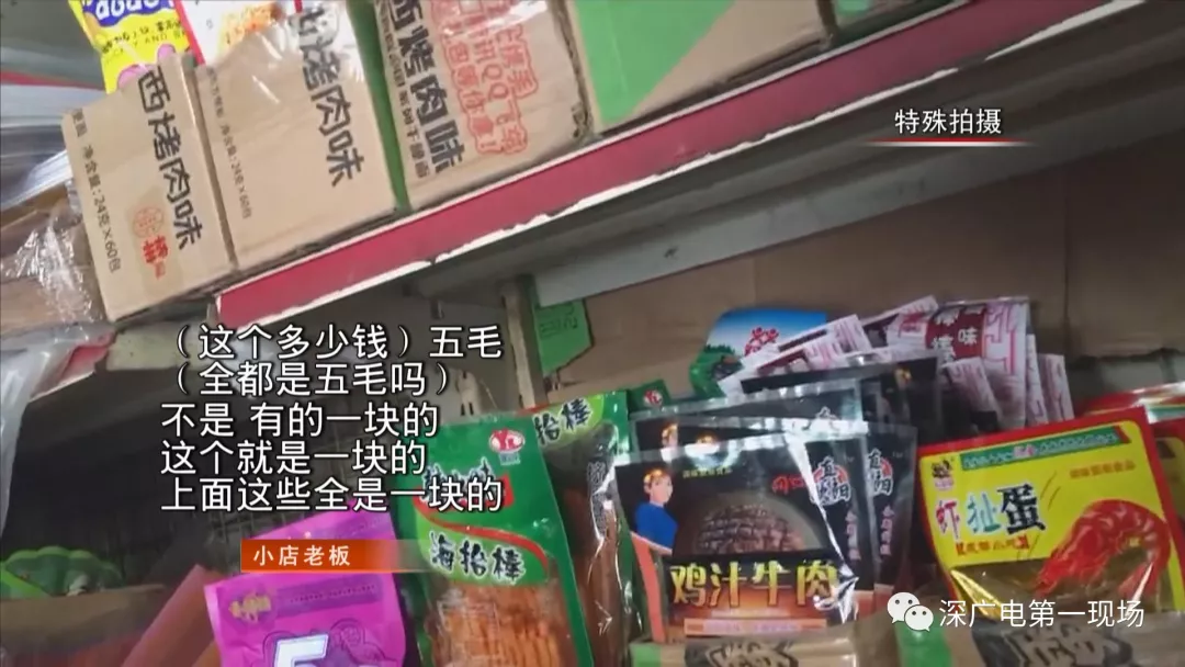 今天上午,記者首先來(lái)到福田區(qū)新沙小學(xué)附近,可以看到馬路邊上的一家文具店,在門口醒目位置擺放著十幾種包裝各異、色彩鮮艷的小食品,有辣條、牛肉干、薯片等等,老板告訴記者,這些零食價(jià)格都是五毛到兩元不等,而在旁邊的一家店鋪,同樣有售賣類似的五毛食品。