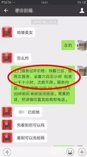 受害人看到招嫖信息主動(dòng)聯(lián)系時(shí),騙子立即承諾服務(wù)內(nèi)容,讓受害人悠然神往,喪失理智。