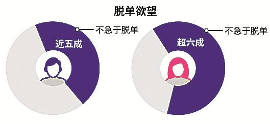 調(diào)查顯示,在脫單欲望方面,近五成單身男性和六成單身女性表示不急于改變單身狀態(tài)。可見(jiàn),單身男女的脫單欲望正在逐漸下降。