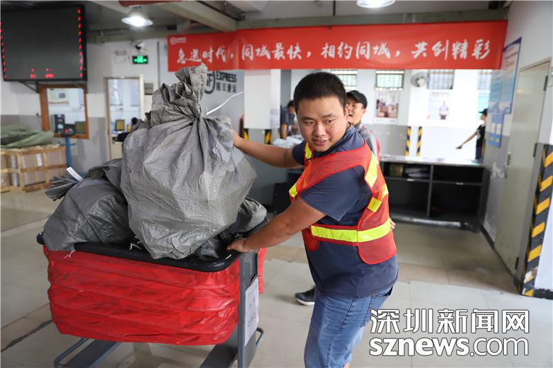 忙碌的田貝營運(yùn)部內(nèi),順豐員工正在搬運(yùn)包裹