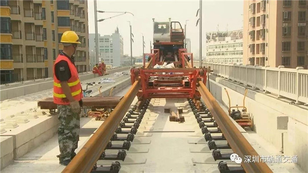 從施工現(xiàn)場可以看到,鋪軌機把長軌放入無碴道床就位,當鋼軌最后精準就位后,要求正負誤差不超過1毫米。目前鋪軌進度至少每天7公里,11日上午從金沙站開始不停歇作業(yè),到下午兩點鋪軌作業(yè)已臨近深圳。項目建設(shè)者表示,大約本月20號鋪設(shè)到深圳機場北站。