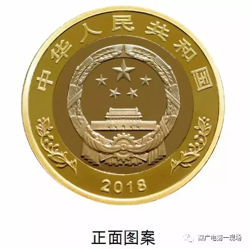 雙色銅合金紀念幣正面圖案為國徽,國徽上方刊“中華人民共和國”國名,下方刊年號“2018”字樣,左右兩側為果實圖案。