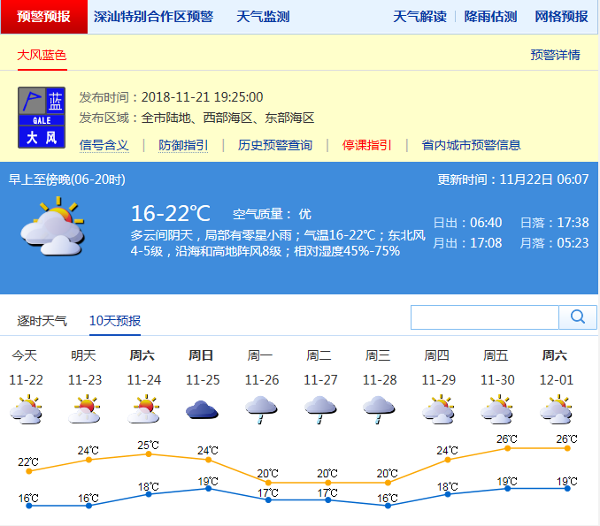據(jù)氣象測報,20日夜間到21日白天,深圳多云,局地有零星小雨,早晨最低氣溫21-23℃,白天最高氣溫27-29℃。但從21日夜間開始,深圳受冷空氣影響,陰天有分散小雨,沿海和高地陣風7-8級,天氣顯著轉(zhuǎn)涼;22日午后風力逐漸減弱,轉(zhuǎn)多云;23-24日,以晴天到多云天氣為主,可見陽光,早晚清涼;25日云量增多,偶有分散小雨;26-28日受冷空氣補充影響,陰天有小雨。