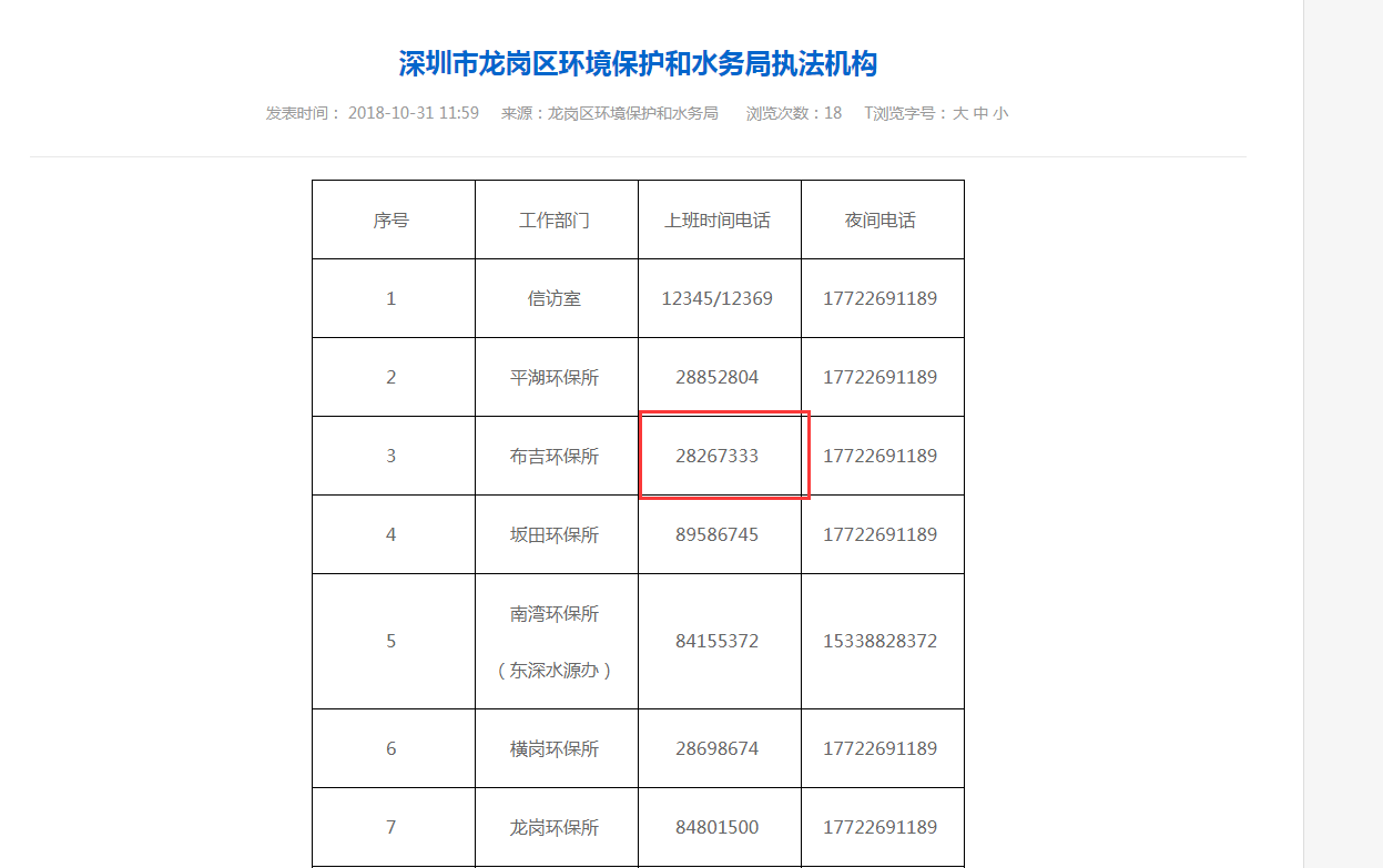 深圳市龍崗區(qū)環(huán)境保護和水務(wù)局官網(wǎng)掛出的布吉環(huán)保所電話