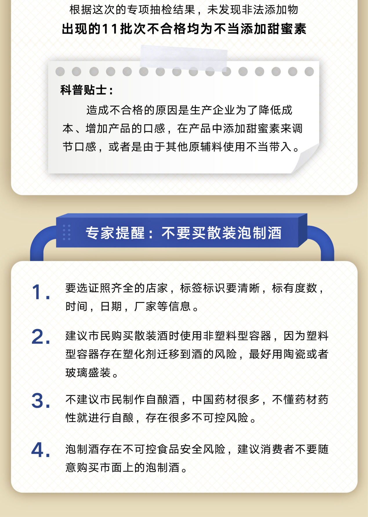 4.泡制酒存在不可控食品安全風(fēng)險(xiǎn),建議消費(fèi)者不要隨意購(gòu)買(mǎi)市面上的泡制酒。
