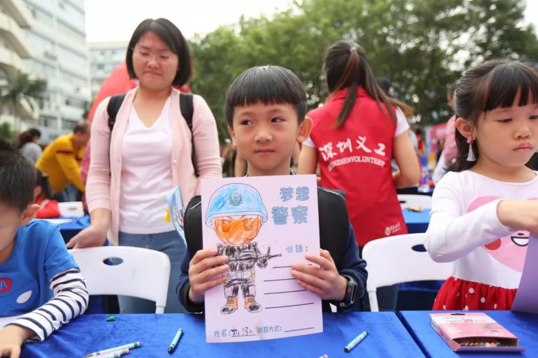 最具童年味道和勃勃生機(jī),大人和小孩現(xiàn)場(chǎng)涂鴉,寫出對(duì)警察想說的話,也可以在畫架畫板上畫出自己心目中的警察,在孩子心中種下警察的種子,滿滿的寄語(yǔ),是對(duì)福田警察的祝福和期待,這也是警察蜀黍肩膀上沉甸甸的責(zé)任和勇往直前的力量!