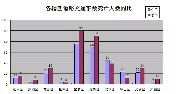 今年以來,在全市各行政區(qū)(新區(qū))中,實現(xiàn)道路交通事故死亡人數(shù)下降的有7個區(qū)。其中寶安區(qū)事故死亡人數(shù)減少24人,龍崗區(qū)事故死亡人數(shù)減少22人,這兩個我市傳統(tǒng)的事故多發(fā)區(qū)事故死亡人數(shù)下降數(shù)占全市事故死亡人數(shù)下降總?cè)藬?shù)的79.31%。