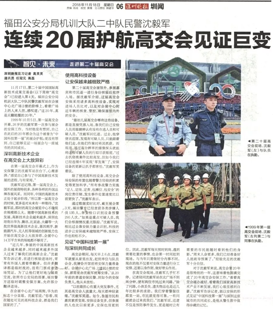 ★★11月18日,為期五天的第二十屆中國國際高新技術(shù)成果交易會在深圳會展中心圓滿落幕。福田公安分局在高交會警力部署、科技管控、防控打擊、安全宣傳、管理服務(wù)等方面一絲不茍,每日投入千名警力現(xiàn)場值守,實(shí)現(xiàn)了本屆高交會“零警情、零發(fā)案”,確保了各項(xiàng)展會活動安全、有序、順利舉行。