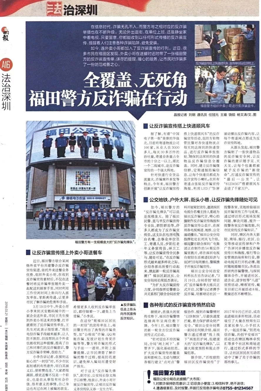 ★★福田警方通過搭建“線上線下”兩張防護(hù)網(wǎng),組建龐大的“反詐騙先鋒隊”,多管齊下,擴(kuò)大反詐騙宣傳的覆蓋面和影響力,最大限度預(yù)防和阻止詐騙犯罪。