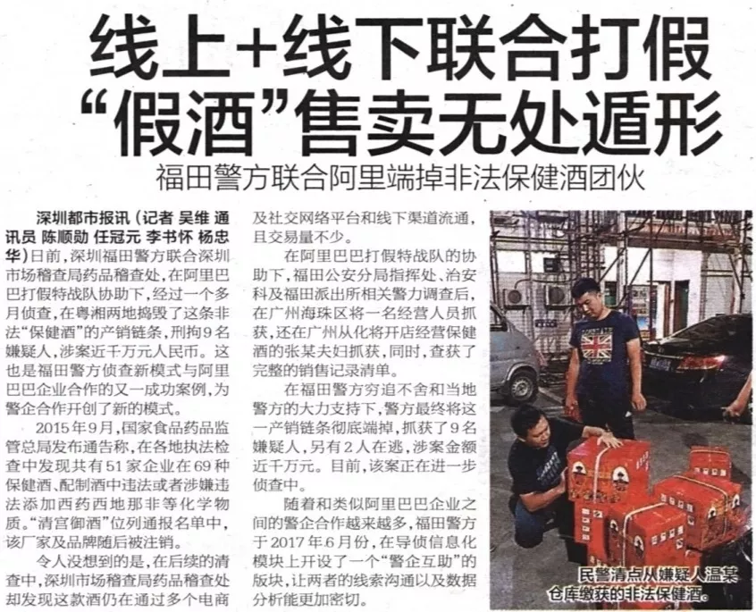 ★★福田警方聯(lián)合深圳市場稽查局藥品稽查處,在阿里巴巴“打假特戰(zhàn)隊”協(xié)助下,經(jīng)過一個多月偵查,于粵湘兩地?fù)v毀了非法“保健酒”的產(chǎn)銷鏈條,刑拘9名嫌疑人,涉案價值近千萬元人民幣。