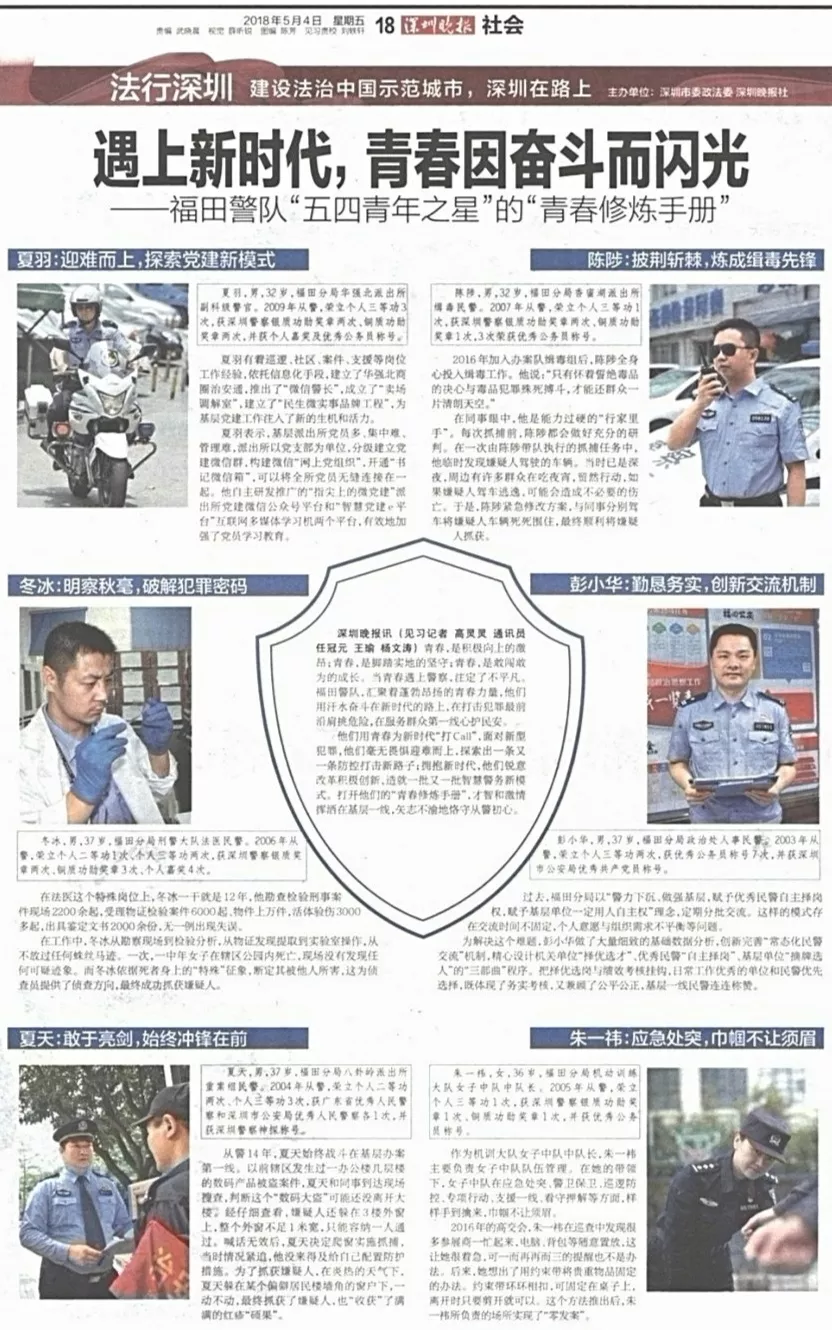 ★★華強北所民警夏羽、香蜜湖所民警陳陟、刑警大隊民警冬冰、政治處民警彭小華、八卦嶺所民警夏天、機動訓(xùn)練大隊民警朱一祎被評為福田警隊“青年之星”,他們是青年民警的優(yōu)秀代表,青春在奮斗中閃光,在砥礪中前行,是警隊的明天與希望。