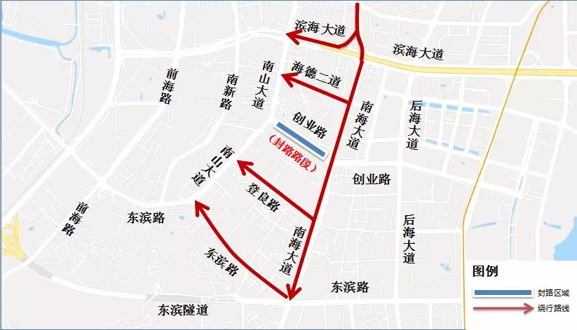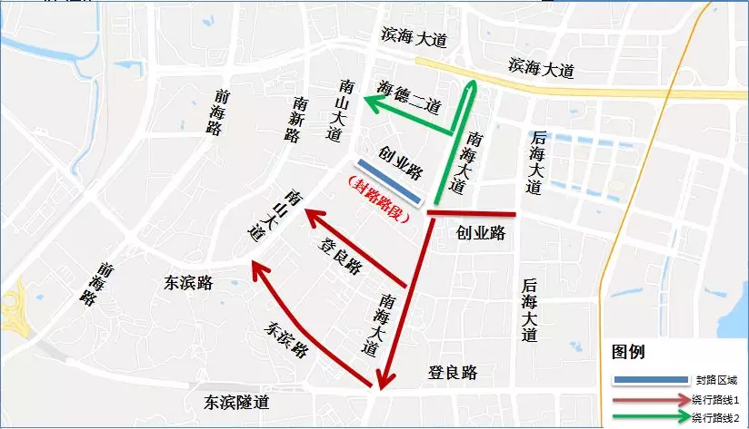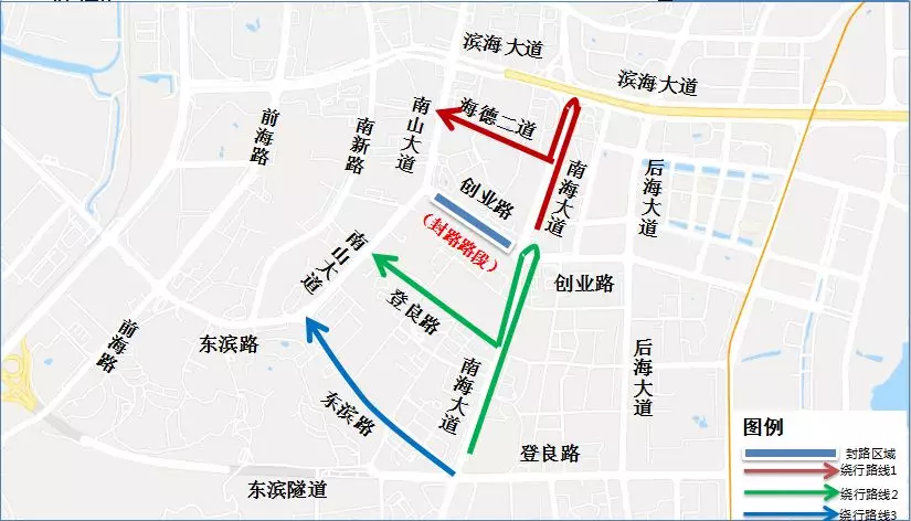 原經(jīng)南海大道創(chuàng)業(yè)路口轉(zhuǎn)入創(chuàng)業(yè)路西行,前往南山大道的車(chē)輛,可按以下路線繞行