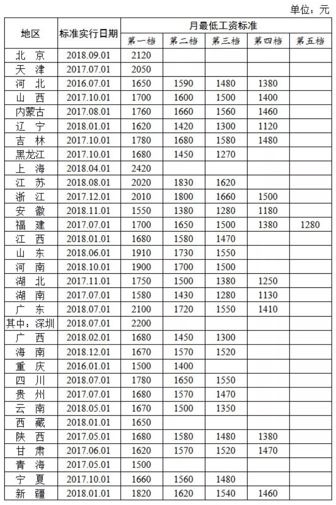 ①人社部10日公布全國各地區(qū)月最低工資標準情況(截至2018年12月),其中,上海月最低工資標準達到2420元,為全國最高。上海、廣東、北京、天津、江蘇、浙江這6個省份月最低工資標準超過2000元。(深圳最低工資標準已于2018年8月1日起調(diào)整,全日制就業(yè)勞動者最低工資標準為2200元/月,非全日制就業(yè)勞動者小時最低工資標準為20.3元/小時。)