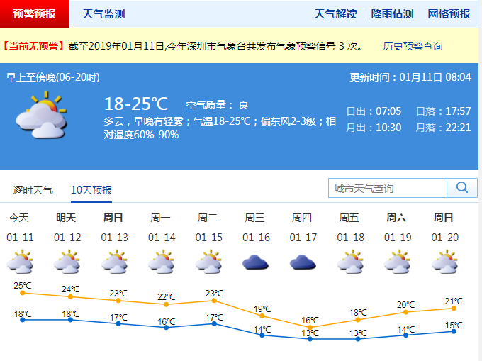 記者從深圳市氣象局了解到,11日陰天,早晚有輕霧,氣溫17-22℃;12-15日多云間陰天,早晚能見度低,可見陽光,天氣平穩(wěn),氣溫小幅波動;15日夜間起受新一輪冷空氣影響,陰天伴有分散小雨,北風加大,氣溫下降。