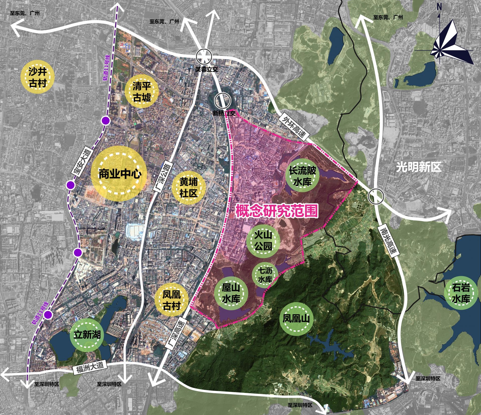 概念規(guī)劃范圍包含詳細設(shè)計范圍在內(nèi)的周圍關(guān)聯(lián)緊密地區(qū),用地約10平方公里,北至新玉路和外環(huán)高速,西至廣深高速,南至鳳凰第二工業(yè)區(qū),東部為包含“三庫一園”(屋山水庫、長流陂水庫、七瀝水庫及火山公園)在內(nèi)關(guān)聯(lián)緊密的自然山體、水等要素。