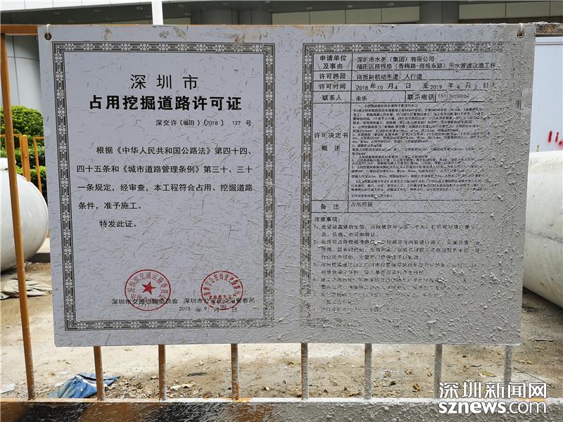 福田區(qū)商報(bào)路施工現(xiàn)場(chǎng)掛有”占用挖掘道路許可證“