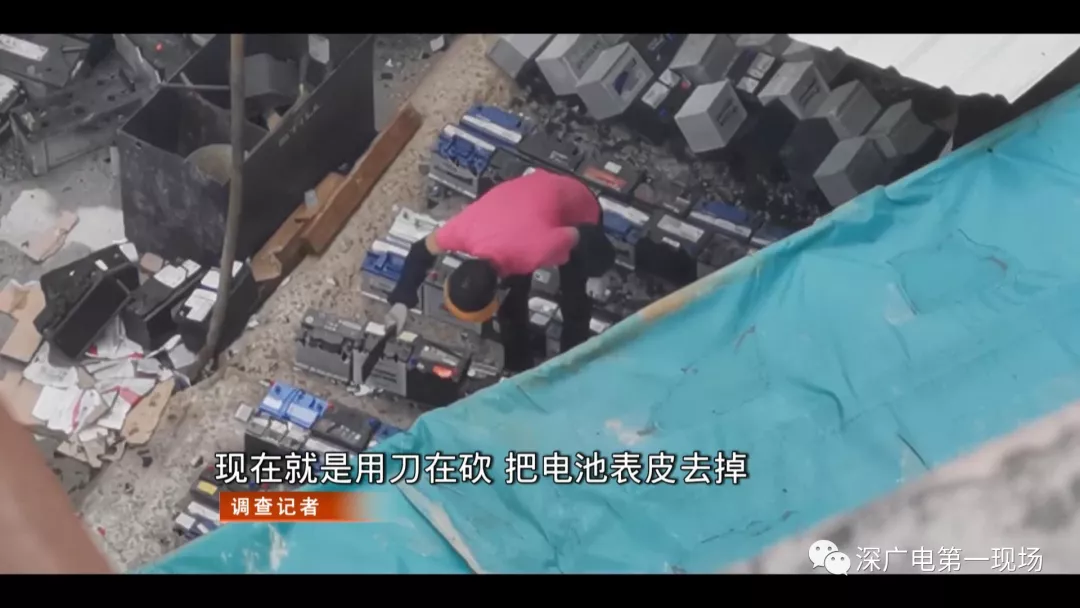 在前期的暗訪中記者發(fā)現(xiàn),3名工人拿著類似砍刀的工具,用簡單粗爆方法,對電池進行拆解,帶有強腐蝕性的電池廢液,無任何處理,滿地橫流。