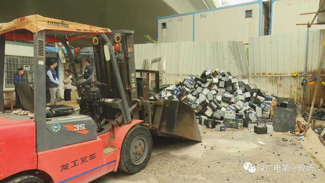 這是昨天下午2點多,記者跟隨南山區(qū)環(huán)保水務(wù)執(zhí)法人員,到現(xiàn)場查處時看到的情形。一處近500平米廢品回收場站內(nèi),廢舊電池堆積如山。