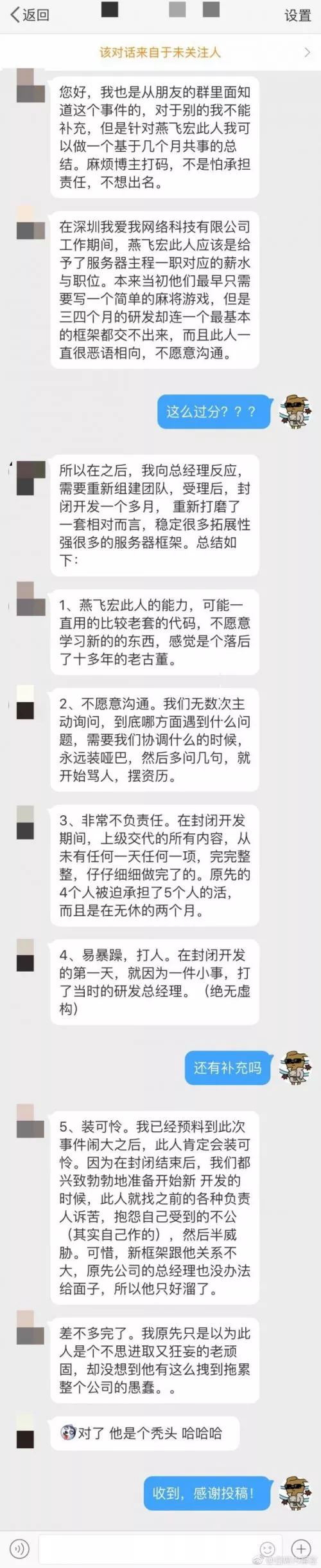 隨后,一位自稱是燕飛宏前同事的網(wǎng)友發(fā)文稱:之前的公司讓他做很簡(jiǎn)單的游戲,但是他三四個(gè)月連框架都沒(méi)寫出來(lái),業(yè)務(wù)能力只會(huì)用老套代碼,不愿意跟同事溝通,工作很不負(fù)責(zé)任、易暴躁、打人。