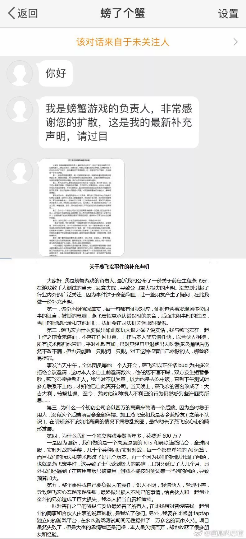 隨后,一位自稱是燕飛宏前同事的網友發(fā)文稱:之前的公司讓他做很簡單的游戲,但是他三四個月連框架都沒寫出來,業(yè)務能力只會用老套代碼,不愿意跟同事溝通,工作很不負責任、易暴躁、打人。