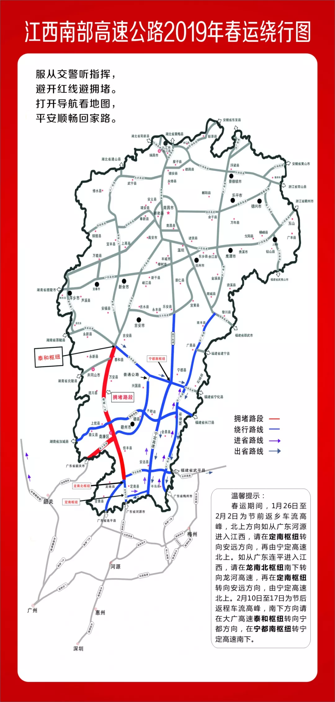 由長深高速北上,在廣東河源市境內轉龍河高速進入江西,后由定南樞紐轉寧定高速聯(lián)絡線(S86),38公里后再由寧定高速北上,以避開大廣高速擁堵路段。
