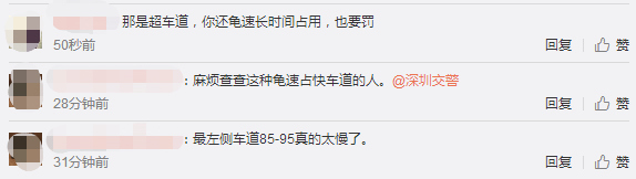 1月28日下午5點,深圳交警在微博上也給網(wǎng)友作出回復(fù),對于長時間龜速占用超車道的行為也將一并調(diào)查。