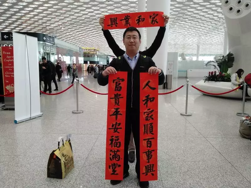 宋先生當(dāng)天10:50的飛機出發(fā)去上海再轉(zhuǎn)機回老家山東,他選擇了“人和家順百事興,富貴平安福滿堂”橫批“家和業(yè)興”,一個個“家”“安”“和”等字樣表達了他的新年愿望:希望家人平平安安。