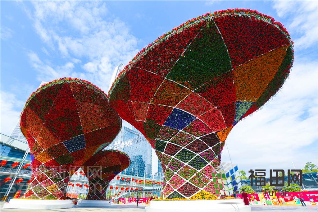 在會(huì)展中心門口,首先映入眼簾的便是一座高15米,寬40米的迎春花市門樓。記者了解到,該門樓本身就是一件花卉藝術(shù)作品,主題為——花開鵬城。以盛開抽象的花形為設(shè)計(jì)元素,采用流暢的交織曲線并結(jié)合七彩花卉,打造一種花開鵬城的韻味,突出迎春花市的氣息。