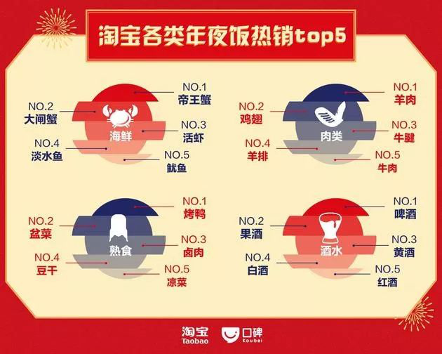 海鮮、肉類、熟食、酒水是消費(fèi)者最愛在淘寶采購的四類年貨。而啤酒則贏過白酒、黃酒,成為中國人最愛選的年夜飯酒水。