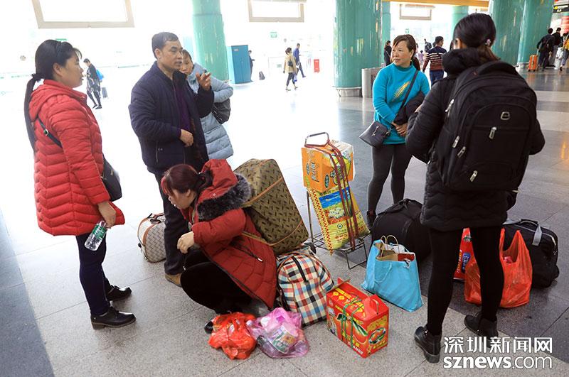 不少旅客攜帶當?shù)厮约凹亦l(xiāng)特產返回深圳,圖中這一家人下車后整理行李