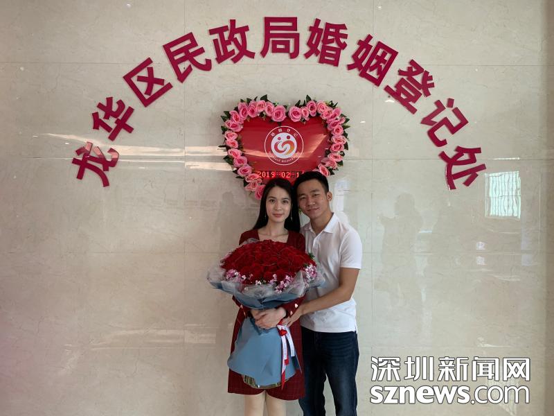 曾林雪和丈夫劉家勇在龍華區(qū)婚姻登記處拍照