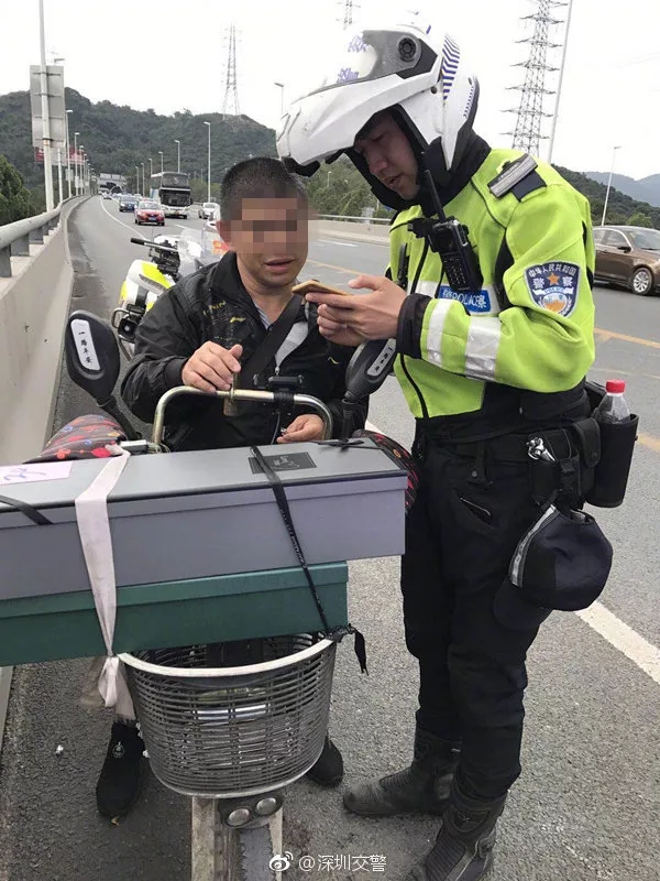 2月14日上午,深圳交警巡邏至南坪快速長嶺陂大橋時發(fā)現(xiàn)一輛非機動車上快速路。上前詢問后得知,男子是幫客戶送禮物的,不料卻迷路了,這才誤闖了快速路。蜀黍?qū)ζ浣逃螅杆賹?dāng)事人護送下快速路路口。