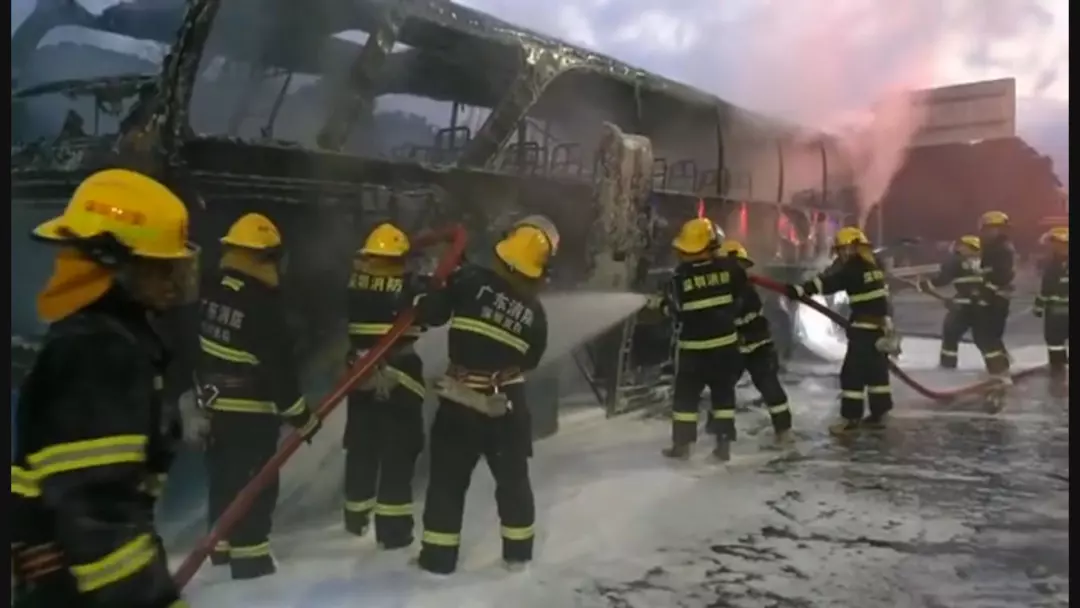 通過泡沫滅火劑覆蓋的方式,火勢(shì)最終得到控制,但整個(gè)大巴也被燒的只剩下框架。車上的兩名司機(jī)介紹,他們從桂林發(fā)車來到深圳,因?yàn)閯倓傇诟浇囌鞠驴?,車上并無乘客。而起火原因兩人也并不清楚。