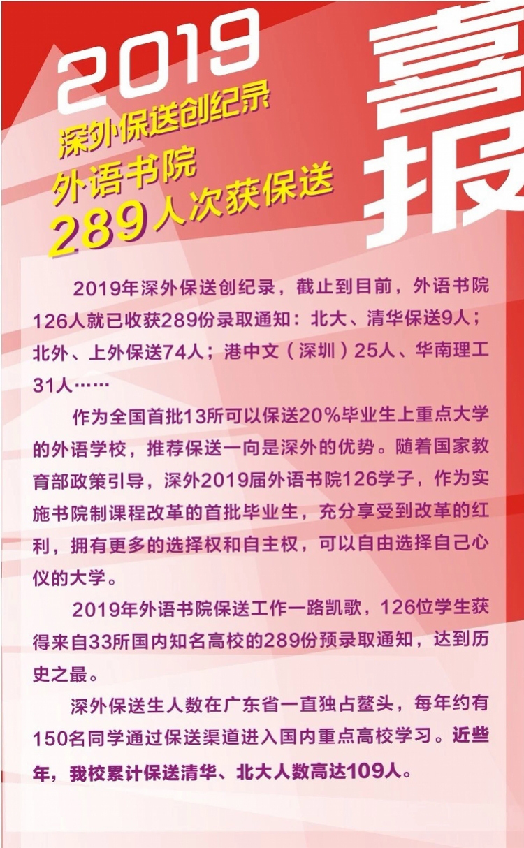 深圳晚報2019年02月17日訊 2月16日,記者從深圳外國語學(xué)校獲悉,該校2019年保送創(chuàng)紀錄。截至目前,該校外語書院126人收獲289份預(yù)錄取通知,其中北京大學(xué)、清華大學(xué)保送9人;北京外國語大學(xué)、上海外國語大學(xué)保送74人;香港中文大學(xué)(深圳)25人、華南理工大學(xué)31人……