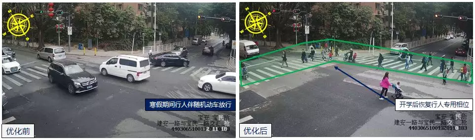 春季開學(xué),清林路/龍?zhí)堵房诘嚷房诨謴?fù)上下學(xué)期間行人專用相位,在學(xué)生過街需求大的時段,運(yùn)行行人專用相位,分離人、車交織,保障學(xué)生過街安全。