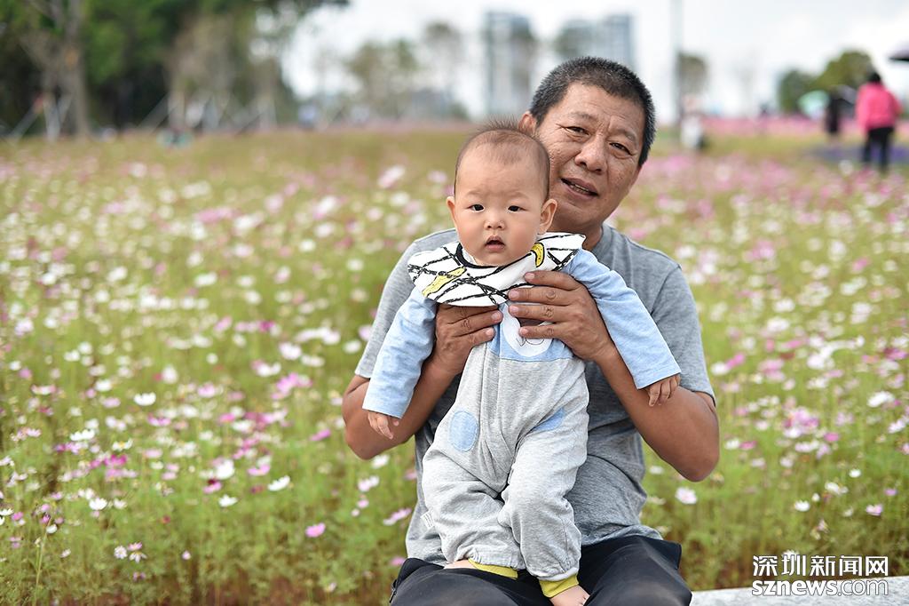 波斯菊花海前,一位爺爺和他的孫子正在花旁休息