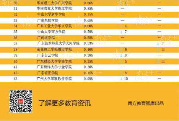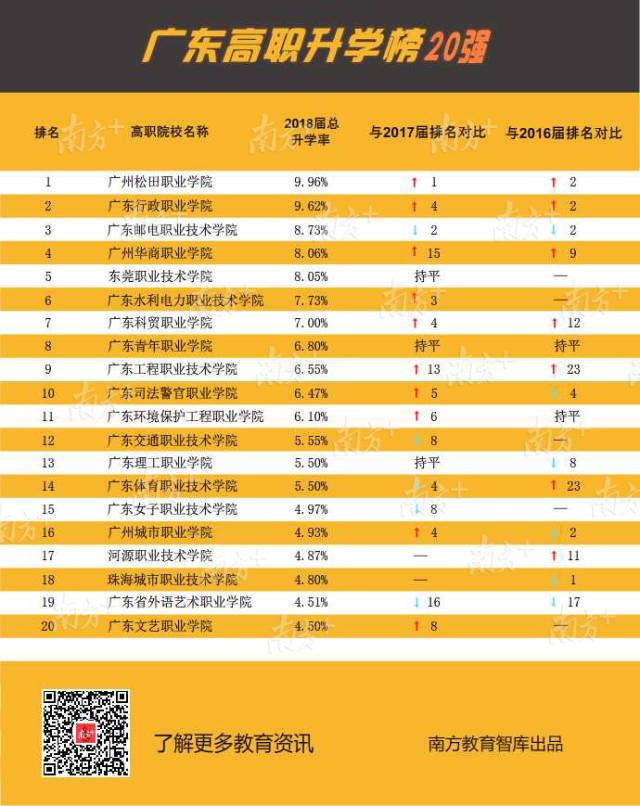 近3年各高職升學數(shù)據(jù)顯示,越來越多畢業(yè)生通過升學提升自身競爭力,尤其2018屆升學率增長明顯。其中有7所高職院校的畢業(yè)生升學率達到或超過7%,分別是廣州松田職業(yè)學院9.96%、廣東行政職業(yè)學院9.62%、廣東郵電職業(yè)技術學院8.73%、廣州華商職業(yè)學院8.06%、東莞職業(yè)技術學院8.05%、廣東水利電力職業(yè)技術學院7.73%和廣東科貿(mào)職業(yè)學院7.00%。