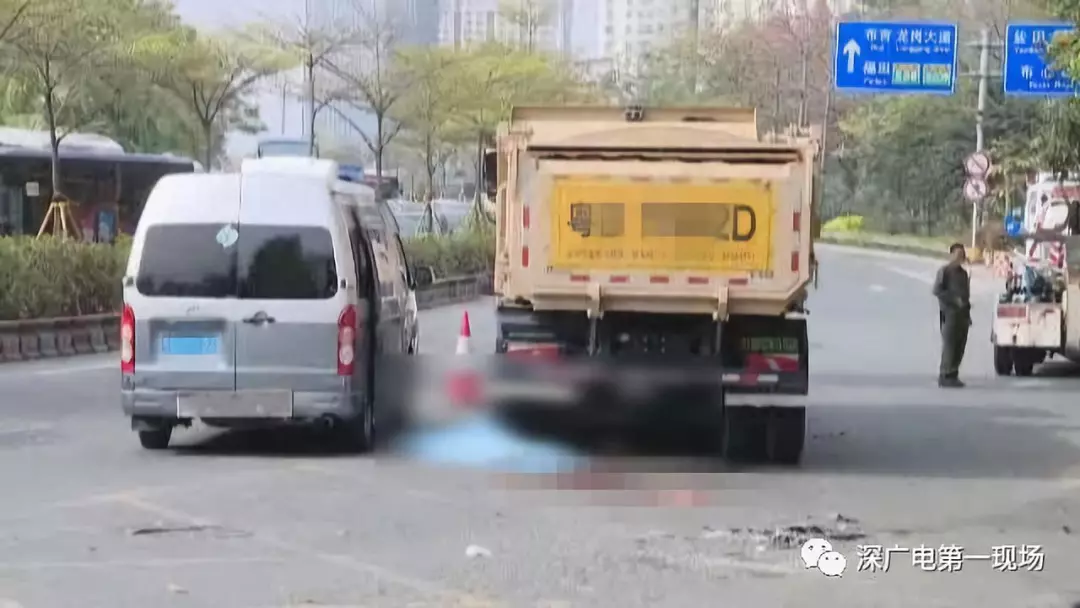 下午3點左右,第一現(xiàn)場記者趕到事發(fā)現(xiàn)場,文錦北路與水貝二路交界處的路口。肇事泥頭車車頭朝北停在路邊,左后輪下方及后面一片血肉模糊,遇難者的遺體還被壓在下方。
